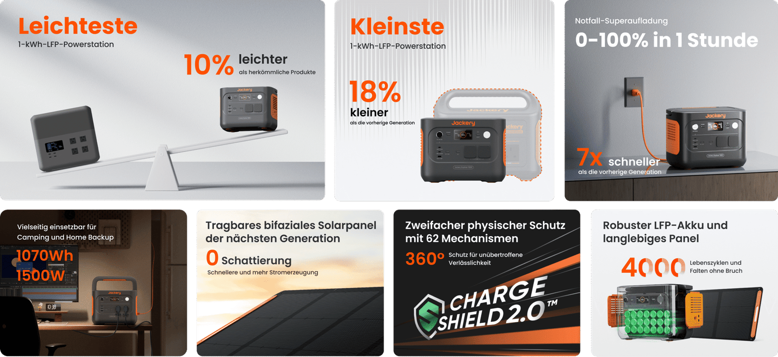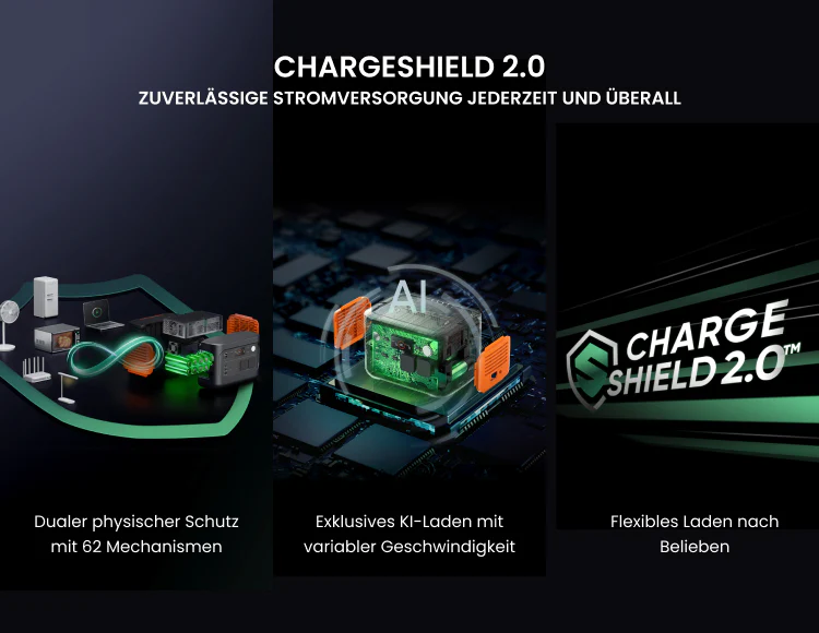 Erleben Sie Sicherheit auf höchstem Niveau mit Jackery 1000 v2. Ausgestattet mit der aktualisierten ChargeShield 2.0-Technologie bietet es verschiedene Lademodi, darunter Schnellladung, Notfall-Superladung und flüsterleises Laden. Stellt sicher, dass Sie immer mit Strom versorgt und einsatzbereit sind. Mit doppeltem physischem Schutz mit 62 Mechanismen innen und außen, die umfassende Sicherheit für ein beruhigendes Gefühl beim Energieverbrauch bieten.