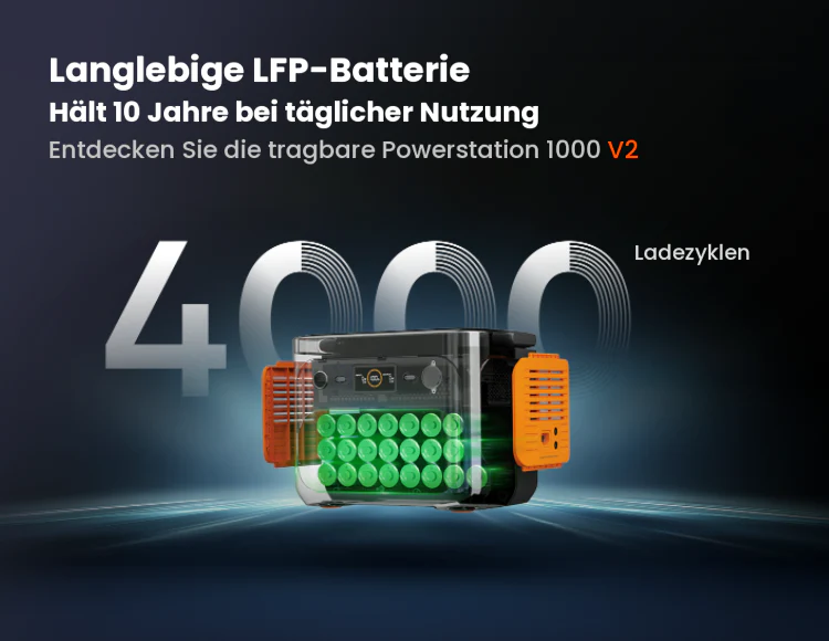 Der Explorer 1000 V2 bietet mit seinem hochwertigen LiFePO4-Akku (LFP) eine lange Lebensdauer und Zuverlässigkeit. Erleben Sie bis zu 10 Jahre Nutzung und 4000 Ladezyklen bei 70% Kapazität – ideal für all Ihre Energiebedürfnisse.
