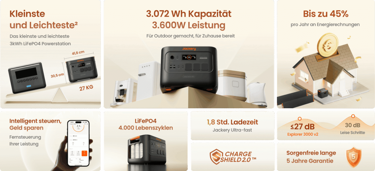 Der Jackery Explorer 3000 v2 wurde für den netzunabhängigen und häuslichen Strombedarf entwickelt und bietet eine Kapazität von 3.072 Wh mit einer reinen Sinuswellenleistung von 3.600 W (7.200 W Surge) – genug, um Wasserkocher, Elektrowerkzeuge und andere Elektrogeräte im Freien zu betreiben. Es verfügt über 3x 230V~13A EU-Steckdosen, 2x 100W USB-C (für Laptops), 2x 18W USB-A und einen 12V⎓10A Carport zum gleichzeitigen Aufladen von Geräten, Elektronik und Campingausrüstung. Mit stabiler Stromversorgung für die meisten Bedürfnisse zu Hause und im Freien ist es Ihre All-in-One-Energielösung.