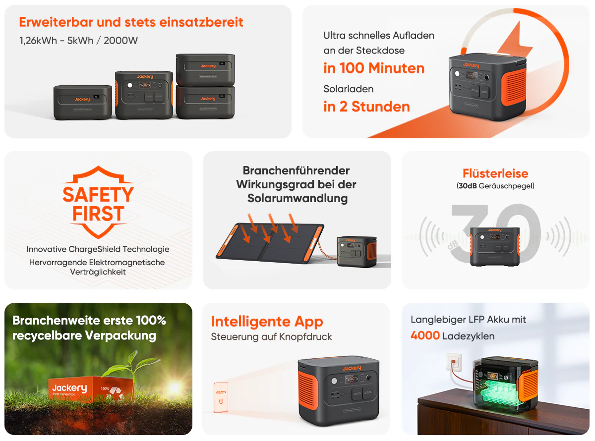 Unsere Produkte zeichnen sich durch eine vollständig umweltfreundliche und recycelbare Verpackung mit null Emissionen aus, was unser Engagement für Nachhaltigkeit und Umwelt unterstreicht. Jackery hat mit der CO2-Fußabdruck-Zertifizierung durch den TÜV SÜD einen Pionierstatus in der Branche erreicht. Diese Anerkennung umfasst eine Reihe von Produkten, darunter die Jackery Plus Serie 300 Plus/1000 Plus/2000 Plus, die Pro Serie 2000 Pro/1500 Pro/1000 Pro und die SolarSaga Serie 80W/100W/200W.